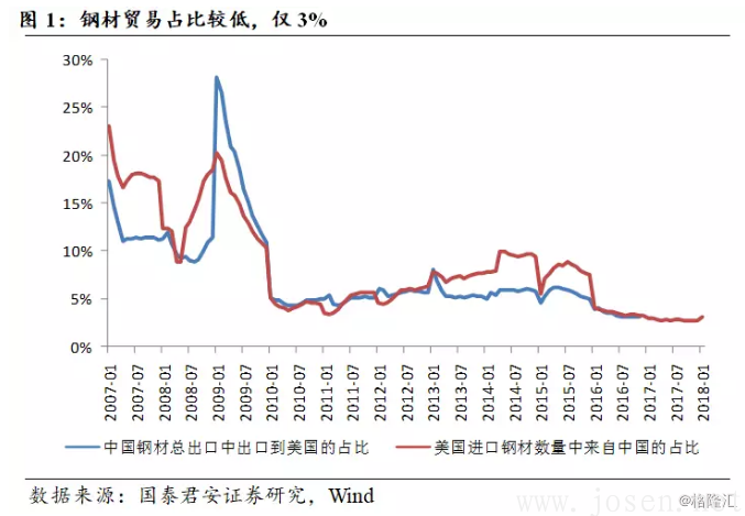 當前貿易摩擦主要集中在鋼材方面,此類產品在整個貿易中微不足道,但或意味著摩擦加劇的開始。3月9日,特朗普正式簽署關稅法令,將對進口鋼鐵和鋁分別征收25%和10%的關稅,15天后生效。同時,該法令也展示出一定的靈活性,加拿大、墨西哥和澳大利亞成為豁免國,其它國家也有可能經過談判被豁免。2010年之前,中國鋼材出口的國別貢獻中美國占比在10%以上,在2007年之前甚至接近20%;與此同時,美國進口鋼材中來自中國的占比也在10-20%之間徘徊。2010年后,鋼材在中美各自角度中的占比下降至5%左右,及至目前,降至3%,此次特朗普對鋼材、鋁征收關稅,我們預計在單一產品層面影響相對有限。