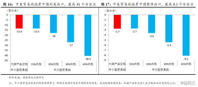 ● 中短期:若是美國普征15%的關稅,那么使得中國對美國出口比基準情形下降14%,拖累總出口2.7個百分點;但是若美國普征45%關稅,則會拖累對美出口41個百分點和整體出口8.1個百分點。