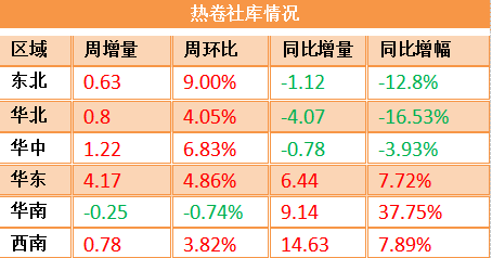 熱卷庫存周環比增加區域擴大,本周僅華南地區出現降庫,其余市場較上周庫存均有增加,但從總庫存量來看,華北、華中、東北同比去年均有所下降,目前熱卷庫存壓力較大的集中在華南地區,關注后續降庫情況。