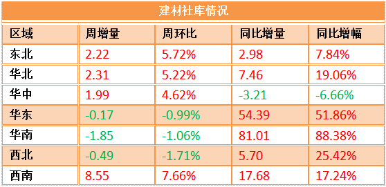 本周累庫區域增加,且建材總庫存壓力較大。其中,東北、華北、華中、西南地區周環比出現上升,華東和華南地區同比去年庫存增幅超過50%,庫存有進一步累增的可能。