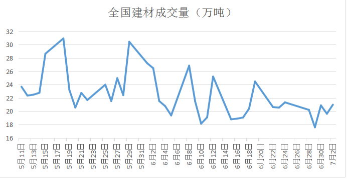 鋼材受強(qiáng)降雨影響成交不佳,6月末全國建材創(chuàng)出近兩個(gè)月成交新低,7月開局成交量略有回升,但依然處于20萬噸左右的相對(duì)低位,淡季需求下滑趨勢更加明顯。