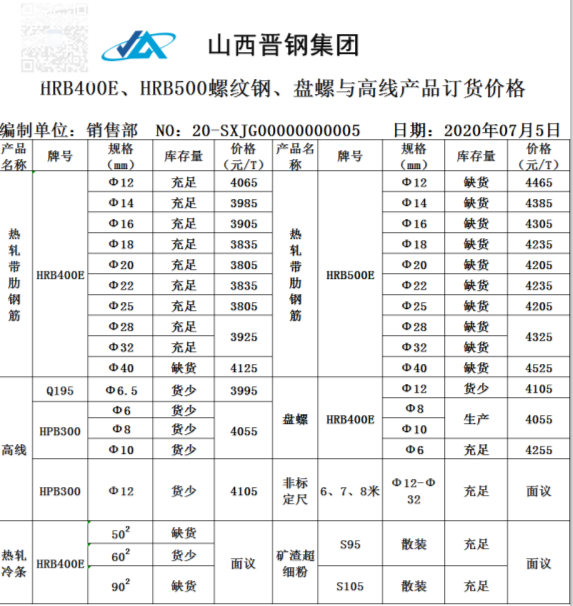 7月5日,石橫特鋼對部分產品出廠價格進行調整,以“7月4日山東石橫特鋼建筑鋼材價格穩定”為基準,具體調整情況如下: