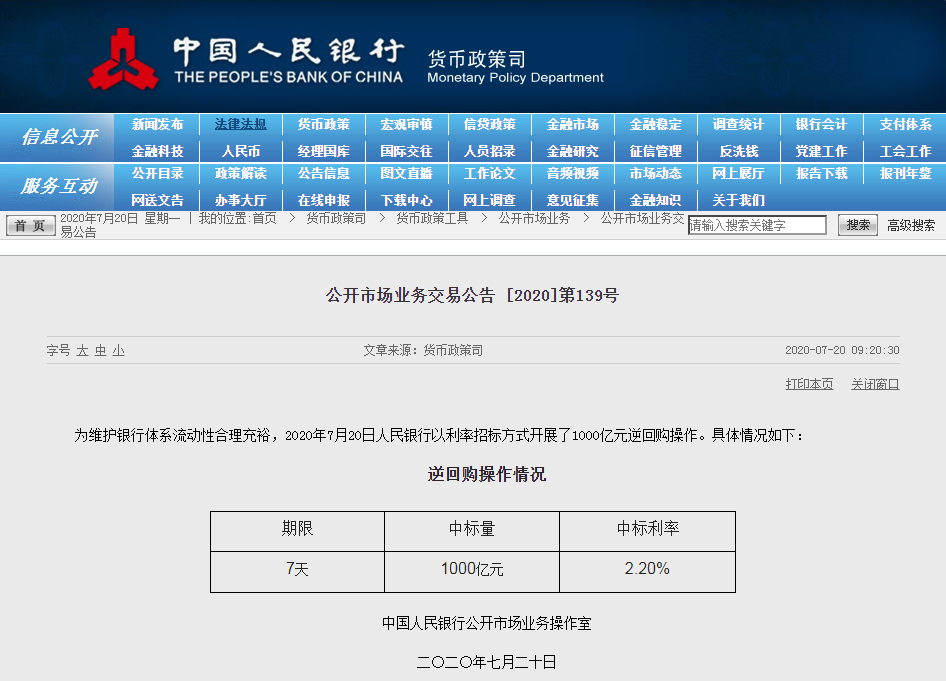 央行今日開展1000億元逆回購操作,因今日有500億元逆回購到期,當日實現(xiàn)凈投放500億元。