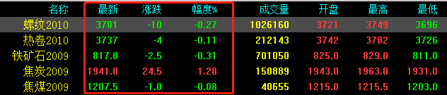 期貨高位震蕩,期螺跌10收報3701,期卷跌4收報3737,鐵礦石跌2.5收報817,焦炭漲24.5收報1941,焦煤跌1收報1207.5。