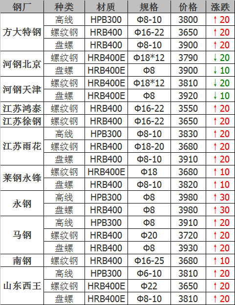 今日鋼廠出廠價格翻紅。華東地區期螺震蕩偏強,現貨挺價意愿有增,市場心態較為堅挺。華北地區價格震蕩,淡季因素仍明顯,下游入市謹慎不積極,整體成交量不佳。華南地區庫存維持在一般正常水平,供需基本面呈僵持態勢。中西部地區高位信心不足,逢高積極出貨為主,后市多觀望。預計短期鋼廠價格窄幅調整。