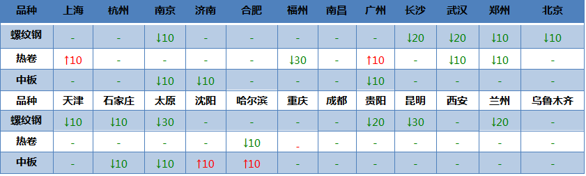 現貨方面,成交一般,商家出貨為主,建材弱于板材,螺紋鋼24個市場中12個市場下跌10-30,均價下調8;熱卷24個市場中3個市場下跌10-30,2個市場上漲10,均價下調2;中板24個市場中6個市場下跌10,2個市場上漲10,均價下調1。