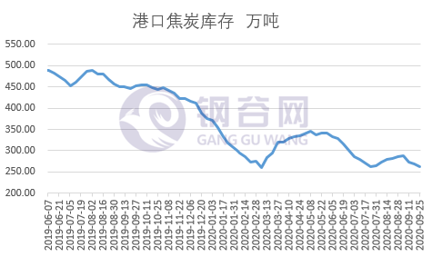 本周國內焦炭第三輪提漲落地。截止本周五山西地區冶金焦漲50,準一級現報1800-1850元/噸,二級1700-1750元/噸;烏海地區主流焦企二級冶金焦漲50,現報1650元/噸;河北地區冶金焦漲50,準一級現報1890元/噸;陜西地區冶金焦漲50,一級現報1930元/噸。本周焦炭市場第三輪提漲基本落地,經三輪上漲后,焦企利潤高位,積極生產,下游訂單充足,廠內多數無庫存。下游鋼廠由于鋼材價格弱勢下跌,高爐開工率高位回調,但仍然處高位,對焦炭需求仍較好,多數鋼企節前適量補庫,支撐焦價高位運行。港口庫存262萬噸,較上周下降6.5萬噸,考慮到目前焦炭市場供應依舊偏緊,節前焦炭市場或持穩運行。