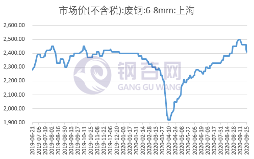 本周國內廢鋼市場繼續下跌下行。截至本周五上海廢鋼2410元/噸,較上周降50元/噸;張家港廢鋼2370元/噸,較上周降70元/噸;唐山廢鋼2570元/噸,較上周降20元/噸,西安廢鋼2310元/噸,較上周降80元/噸。本周黑色系商品期貨、鋼坯和成品材等集體弱勢下跌,受此影響廢鋼市場恐慌情緒加劇,貿易商出貨積極性增加,鋼廠利潤低位,對廢鋼打壓意愿強烈,順勢下調廢鋼采購價,沙鋼24、25日連續兩日對廢鋼價格下調50元/噸,周邊鋼廠紛紛跟跌,開啟又一波廢鋼跌價潮,但考慮到目前廢鋼整體資源量仍處偏緊狀態,鋼廠對廢鋼需求維持高位,價格跌后恐慌情緒釋放,節前廢鋼市場或以弱勢盤整運行為主。