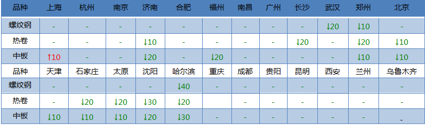 螺紋鋼24個(gè)市場中3個(gè)市場下跌10-20, 20mmHRB400E平均價(jià)格3724元/噸,較上個(gè)交易日下調(diào)3元/噸。