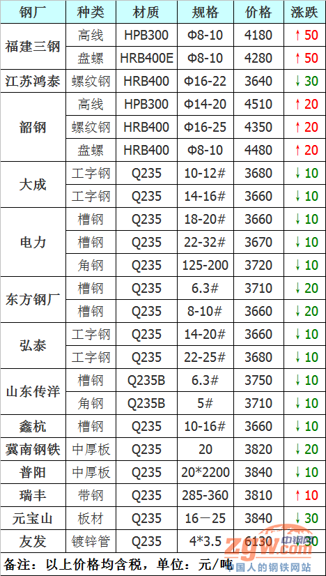 據數據監測,今日共22家鋼廠調價,其中漲幅最高為福建三鋼建材,調價幅度50元/噸,跌幅最大為元寶山板材,調價幅度30元/噸,具體調價明細如下: 鋼廠調價 唐城工字鋼價格平穩 萊鋼永鋒建材價格平穩 石橫特鋼建材價格平穩 江蘇雨花建材價格平穩 河鋼天津建材價格平穩 河鋼北京建材價格平穩 山西美錦建材價格平穩 鑫億源H型鋼價格平穩 韶鋼建材上調20元/噸 福建三鋼建材上調50元/噸 瑞豐帶鋼價格上調10元/噸 冀鋼中厚板下調20元/噸 元寶山板材下調30元/噸 普陽中厚板下調10元/噸 東方鋼廠槽鋼下調20元/噸 山東傳洋型材下調10元/噸 大成工字鋼下調10元/噸 弘泰工字鋼下調10元/噸 電力型材下調10元/噸 鑫杭槽鋼下調10元/噸 友發鍍鋅管價格下調30元/噸 江蘇鴻泰螺紋鋼下調30元/噸 鋼廠調價占比 上調3家,占比13.6%,調價幅度10-50元/噸。 下調11家,占比50%,調價幅度10-30元/噸。 平穩8家,占比36.4%。 重要產業信息 一、預期2020年全球鋼鐵需求將下降2.4% 世界鋼鐵協會:預期2020年全球鋼鐵需求將下降2.4%至17.25億噸(此前預期為下降6.4%),預期2021年全球鋼鐵需求將增長4.1%至17.95億噸,預期2021年中國鋼鐵需求將保持平穩,發達經濟體的鋼鐵需求將增長7.9%。 二、山西發布秋冬季實施錯峰生產計劃 《通知》明確,此次錯峰生產范圍包括鋼鐵、有色、焦化、化工、建材(磚瓦、耐火、陶瓷、石灰、水泥熟料及粉磨站)、鑄造等重點涉氣行業企業(或工序)。 三、黔西南州煤礦9月淘汰落后產能情況 截至9月底,普安縣桂興煤礦和小岔溝煤礦通過省州縣級相關部門關閉驗收,退出產能69萬噸/年;貴州省煤炭工業淘汰落后產能加快轉型升級領導小組辦公室公告興義市超強煤礦和興仁市菜子田煤礦關閉,公告關閉產能90萬噸/年。 四、越南9月鋼材進口為101萬噸 越南海關公布的數據顯示,9月份,越南鋼材進口為101萬噸,較8月下滑15.3%,廢鋼進口環比下降28.9%,至485,625噸。1-9月,越南鋼材進口累計為1,036萬噸,較去年同期下降4%,廢鋼進口同比增加1.1%,至429萬噸。 五、10月上旬11家重點企業汽車銷量同比下降24% 中汽協數據顯示,2020年10月上旬,11家重點企業汽車產銷分別完成45.6萬輛和34.4萬輛,同比分別下降3.8%和