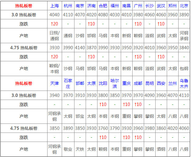 熱卷24個市場中7個市場上漲10,4.75熱軋板卷平均價格3932元/噸,較上個交易日上調4元/噸。
