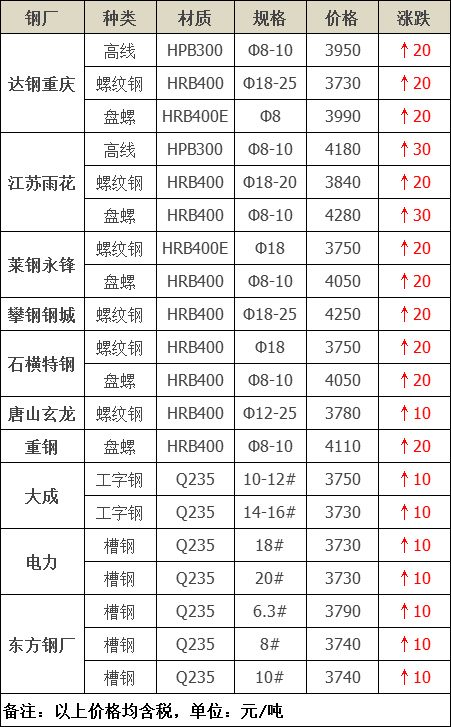 今建材價(jià)格主流上調(diào)!期螺強(qiáng)勢不改,市場交投氛圍活躍,現(xiàn)貨較今晨變動不大。目前下游積極跟漲,商家出貨意愿強(qiáng)烈。預(yù)計(jì)明日或堅(jiān)挺整理。