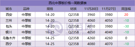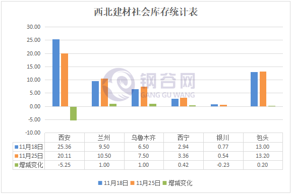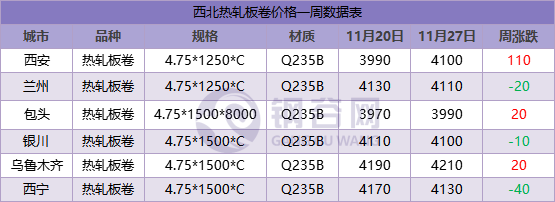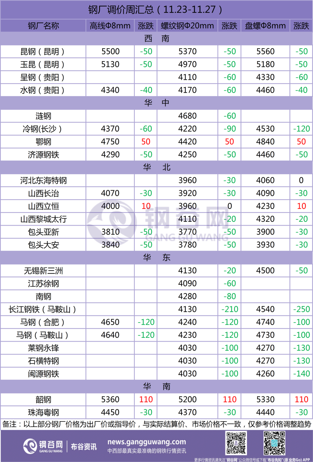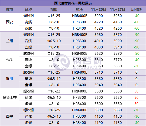 據(jù)鋼谷網(wǎng)數(shù)據(jù)監(jiān)測,本周全國主要城市鋼材市場價格盤整運行,調整空間10-160元/噸,板材強于長材。截止11月27日,全國27個城市螺紋鋼均價4007元/噸,較上周跌57元/噸;全國27個城市高線均價4206元/噸,較上期跌55元/噸;全國27個城市盤螺均價4284元/噸,較上期跌55元/噸;全國27個城市熱軋板卷均價4134元/噸,較上周漲20元/噸;全國27個城市中厚板均價4051元/噸,較上期漲14元/噸。