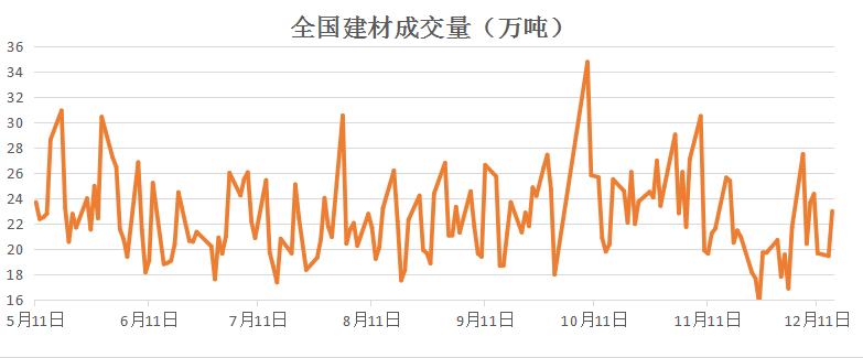近一周全國建材成交量均處于25萬噸以下,需求轉(zhuǎn)弱的跡象較為明顯。從今日市場成交來看,相對謹慎,鋼需用戶逢低采購,且主要集中在缺貨規(guī)格,多數(shù)低量采購。由于北方工地陸續(xù)停工,南方低溫帶來影響,臨近年關(guān),建材淡季需求會更加明顯。