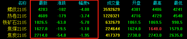 期鋼大幅下跌,期螺下跌182收報4283,期卷下跌179收報4609,鐵礦石下跌63收報1026,焦煤下跌19.5收報1627,焦炭下跌54收報2714。期貨走勢整體較弱。