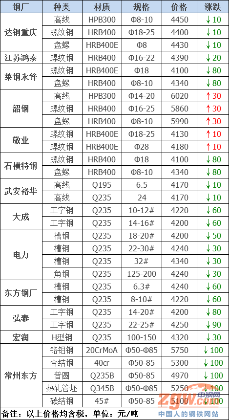據(jù)數(shù)據(jù)監(jiān)測(cè),今日共27家鋼廠調(diào)價(jià),其中漲幅最高為韶鋼建材,調(diào)價(jià)幅度30元/噸,跌幅最大為常州東方優(yōu)鋼,調(diào)價(jià)幅度100元/噸,具體調(diào)價(jià)明細(xì)如下: