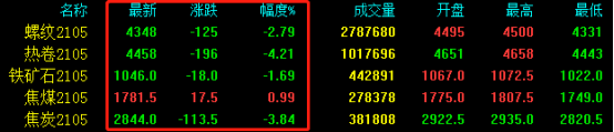 期鋼今日大跌,期螺下跌125收報4348,期卷下跌196收報4458,鐵礦石下跌18收報1046,焦煤上漲17.5收報1781.5,焦炭下跌3.84收報2844。