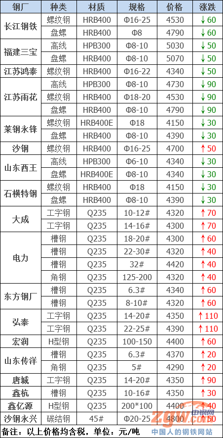 據(jù)數(shù)據(jù)監(jiān)測,今日共28家鋼廠調(diào)價,其中漲幅最高為弘泰工字鋼,調(diào)價幅度110元/噸,跌幅最大為江蘇雨花建材,調(diào)價幅度90元/噸,具體調(diào)價明細如下: 鋼廠調(diào)價 武安裕華高線價格平穩(wěn) 山西高義建材價格平穩(wěn) 河鋼北京建材價格平穩(wěn) 河鋼天津建材價格平穩(wěn) 唐山玄龍螺紋鋼價格平穩(wěn) 沙鋼1月中旬螺紋鋼上調(diào)50元/噸 長江鋼鐵建材下調(diào)60元/噸 福建三寶建材下調(diào)50元/噸 江蘇雨花建材下調(diào)90元/噸 石橫特鋼建材下調(diào)30元/噸 萊鋼永鋒建材下調(diào)30元/噸 山東西王建材下調(diào)30元/噸 江蘇鴻泰螺紋鋼下調(diào)50元/噸 電力角鋼上調(diào)40元/噸 鑫杭槽鋼上調(diào)30元/噸 唐城工字鋼上調(diào)90元/噸 大成工字鋼上調(diào)70元/噸 宏潤H型鋼上調(diào)60元/噸 電力槽鋼上調(diào)40-60元/噸 弘泰工字鋼上調(diào)110元/噸 東方鋼廠槽鋼上調(diào)60元/噸 鑫億源H型鋼上調(diào)40元/噸 山東傳洋型材上調(diào)40元/噸 敬業(yè)中厚板下調(diào)40元/噸 普陽中厚板下調(diào)30元/噸 淮鋼優(yōu)鋼價格平穩(wěn) 沙鋼1月中旬工業(yè)線材平穩(wěn) 沙鋼永興碳結(jié)鋼上調(diào)50元/噸 鋼廠調(diào)價占比 上調(diào)12家,占比42.9%,調(diào)價幅度30-110元/噸。 下調(diào)9家,占比32.1%,調(diào)價幅度30-90元/噸。 平穩(wěn)7家,占比25%。 重要行業(yè)信息 一、12月中國CPI同比增長0.2% PPI同比下降0.4% 中國12月居民消費價格(CPI)同比增長0.2%,預期為0%,前值下降0.5%。2020年CPI同比漲2.5%,預期漲2.5%,前值漲2.9%。中國12月工業(yè)生產(chǎn)者出廠價格(PPI)同比下降0.4%,預期下降0.7%,前值下降1.5%。2020年全年,工業(yè)生產(chǎn)者出廠價格比上年下降1.8%。 二、江蘇省綠色工廠名單(第一批) 近日,江蘇省工信廳發(fā)布了關于公布江蘇省綠色工廠名單(第一批)的通知,其中中新鋼鐵集團有限公司、江蘇常寶普萊森鋼管有限公司、常熟市龍騰特種鋼有限公司、連云港興鑫鋼鐵有限公司、連云港亞新鋼鐵有限公司、江蘇利淮鋼鐵有限公司、揚州恒潤海洋重工有限公司7家鋼企入選。 三、12月重卡銷11.4萬輛再創(chuàng)紀錄 2020年定格162萬輛 2020年12月份,我國重卡市場預計銷售各類車型約11.4萬輛,環(huán)比下降16%,同比增長24%。該銷售數(shù)據(jù)創(chuàng)重卡行業(yè)12月份銷量的新高,比上一個歷史紀錄——2019年12月(9.22萬輛)多出了2.2萬輛左右;這是重卡行業(yè)自2020年以來第十次刷新歷史紀錄。 四、12月挖掘機銷量同比增長56.4% 1月9日,根據(jù)中國工程機械工業(yè)協(xié)會挖掘機械分會行業(yè)統(tǒng)計數(shù)據(jù),2020年12月,共計銷售各類挖掘機械產(chǎn)品31530臺,同比漲幅56.4%。國內(nèi)市場銷量27319臺,同比漲幅58.5%。出口銷量4211臺,同比漲幅44.4%。 五、滬豫鄂晉掀起重大項目開工潮 2020年剛開始,各地掀起重大項目開工潮,上海、河南、湖北、山西等多地集中開工一批重大項目,相關投資規(guī)模均在千億元級別。目前陜西、廣西、江西、湖北等地均已發(fā)布今年重大項目投資計劃,多地計劃投資規(guī)模均在兩三萬億元。