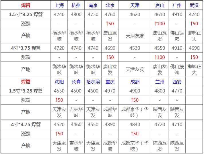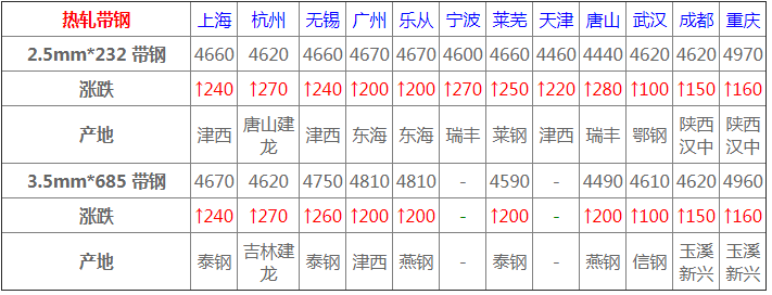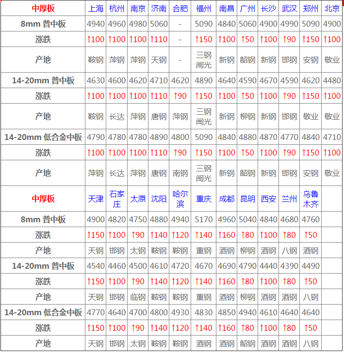 今日熱帶主流上行,價格方面,中天2.5*232規格報4700元/噸;德龍產2.5*255規格報4670元/噸,以上規格均較上一交易日漲250;上海熱帶主流上行,價格方面,?中天2.5*232規格報4600元/噸,津西2.5*204-355報4590元/噸,以上規格均較上一交易日漲160;寧波熱帶主流上行,價格方面,德龍2.5*355報4650元/噸,建龍2.5*355報4660元/噸,以上規格均較上一交易日漲330;萊蕪熱帶主流上行,泰鋼(3.0-4.5)*800報4760元/噸,較上一交易日漲230。
