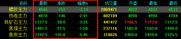受外圍市場影響,國內期鋼加速下跌,回補此前跳空高開的缺口,期螺下跌152收報4696,期卷下跌146收報4878,鐵礦石下跌38收報1127.5,焦煤下跌22.5收報1481.5,焦炭下跌135收報2342.5。