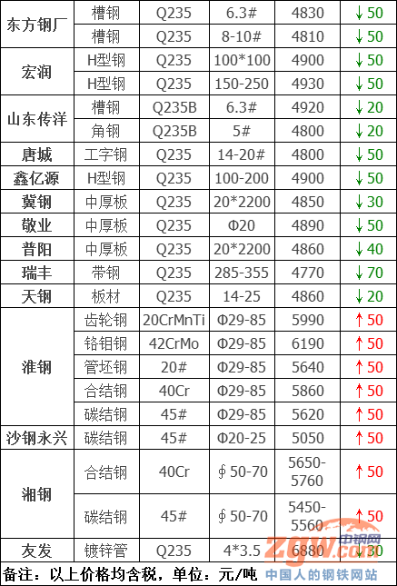 據(jù)數(shù)據(jù)監(jiān)測,今日共31家鋼廠調(diào)價,其中漲幅最高為安陽永興建材,調(diào)價幅度50元/噸,跌幅最大為瑞豐帶鋼,調(diào)價幅度70元/噸,具體調(diào)價明細(xì)如下: 鋼廠調(diào)價 沙鋼3月中旬建材平穩(wěn) 山西宏達(dá)建材價格平穩(wěn) 山西高義建材價格平穩(wěn) 安陽永興建材價格上調(diào)50元/噸 黎城太行建材下調(diào)30元/噸 江蘇雨花建材下調(diào)70元/噸 山東西王建材下調(diào)20元/噸 濟(jì)源鋼鐵建材下調(diào)20元/噸 江蘇鴻泰螺紋鋼下調(diào)50元/噸 武安裕華高線下調(diào)20-40元/噸 河鋼北京建材價格下調(diào)20元/噸 河鋼天津建材價格下調(diào)30元/噸 長江鋼鐵建材價格下調(diào)70元/噸 電力型材價格平穩(wěn) 唐城工字鋼下調(diào)50元/噸 大成工字鋼下調(diào)50元/噸 宏潤H型鋼下調(diào)50元/噸 東方鋼廠槽鋼下調(diào)50元/噸 山東傳洋型材下調(diào)20元/噸 鑫億源H型鋼下調(diào)50元/噸 天鋼板材下調(diào)20元/噸 敬業(yè)中厚板下調(diào)50元/噸 普陽中厚板下調(diào)40元/噸 瑞豐帶鋼價格下調(diào)70元/噸 冀鋼中厚板價格下調(diào)30元/噸 友發(fā)鍍鋅管價格下調(diào)30元/噸 沙鋼永興碳結(jié)鋼上調(diào)50元/噸 湘鋼優(yōu)鋼價格上調(diào)50元/噸 中天鋼鐵優(yōu)鋼上調(diào)50元/噸 淮鋼優(yōu)鋼上調(diào)50元/噸 沙鋼工業(yè)線材價格平穩(wěn) 鋼廠調(diào)價占比 上調(diào)5家,占比16.1%,調(diào)價幅度50元/噸。 下調(diào)21家,占比67.8%,調(diào)價幅度20-70元/噸。 平穩(wěn)5家,占比16.1%。 鋼廠檢修信息 福建凱景彩涂線檢修信息 據(jù)了解,福建凱景彩涂生產(chǎn)線近日進(jìn)行檢修,于3月9日開始檢修,預(yù)計3月20日開機(jī),預(yù)計影響彩涂供應(yīng)0.45萬噸。 重要行業(yè)信息 1、商務(wù)部:上周鋼材價格小幅上漲 煤炭價格小幅下降 據(jù)商務(wù)部監(jiān)測,上周(3月1日至7日)全國鋼材價格小幅上漲,其中普通中板、熱軋帶鋼、高速線材、螺紋鋼價格分別為每噸4834元、4675元、4671元和4557元,分別上漲1.7%、1.7%、1.6%和1.5%。煤炭價格小幅下降,其中動力煤、二號無煙塊煤、煉焦煤價格分別為每噸612元、950元和777元,分別下降1.3%、0.7%和0.1%。 2、敬業(yè)集團(tuán)收購英鋼一周年 英鋼扭虧為盈 3月9日,敬業(yè)集團(tuán)在本部和英鋼舉行了收購英鋼一周年暨敬業(yè)英鋼盈利慶祝大會。英鋼2月份扭虧為盈!這成為敬業(yè)英鋼的重要?dú)v史轉(zhuǎn)折點(diǎn),也給敬業(yè)集團(tuán)收購英鋼一周年送上一份兒大禮!在疫情帶來的全球經(jīng)濟(jì)持續(xù)低迷下,敬業(yè)集團(tuán)引領(lǐng)英鋼逆勢而上、起死回生,創(chuàng)造了令人驚訝的奇跡,不僅證明了中國鋼鐵業(yè)的實力,也給了海內(nèi)外各界關(guān)心人士一個肯定的回答。 3、鐵路建設(shè)支撐歐洲鋼軌需求 根據(jù)歐盟統(tǒng)計局的數(shù)據(jù),截至2018年,歐洲有超過21.5萬千米的鐵路網(wǎng)。歐洲鐵路行業(yè)協(xié)會報告稱,歐洲鋼軌供應(yīng)業(yè)滿足了歐盟鐵路供應(yīng)和服務(wù)市場的84%,歐盟鋼軌供應(yīng)商的絕對銷售額為470億歐元(約580億美元)。歐盟是鋼軌凈出口地區(qū),每年進(jìn)口的鋼軌數(shù)量適中。根據(jù)相關(guān)數(shù)據(jù),2019年,歐盟進(jìn)口鋼軌僅1.7萬余噸,相比之下,歐盟向全球其他地區(qū)供應(yīng)的鋼軌為42.3萬噸。