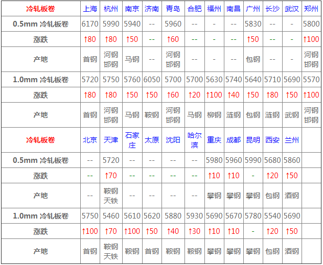 今全國冷軋市場主流上行,幅度50-110元,期貨高開高走,帶動現貨大幅上漲,然下游接受程度普遍較低,整體實際成交一般,大戶心態尚可;預計冷軋板卷價格偏強調整。