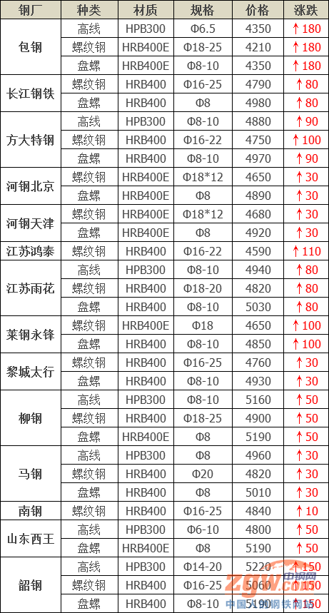 數據監測,今日共30家鋼廠調價,其中漲幅最高為包鋼建材,調價幅度180元/噸,具體調價明細如下:
