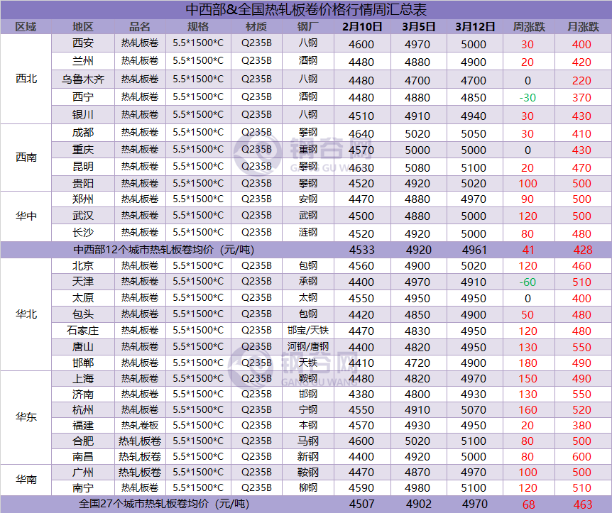 全國建筑鋼材成交價格周/月匯總表(2.10-3.5-3.12)