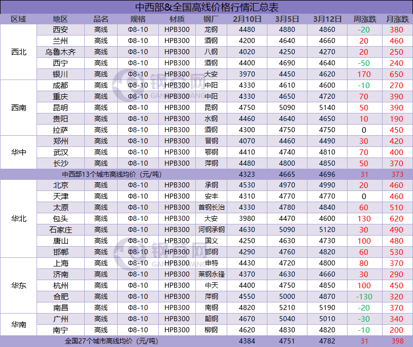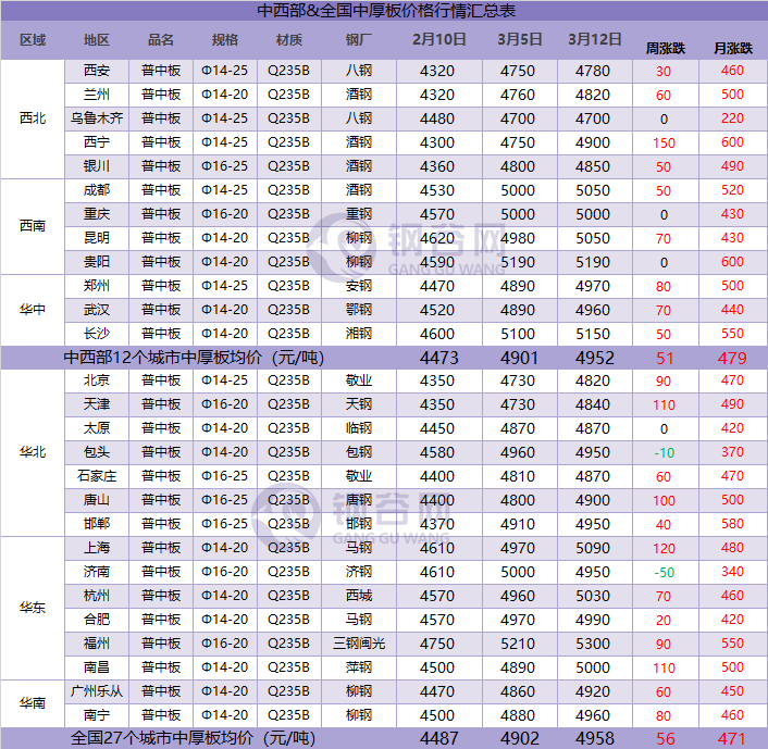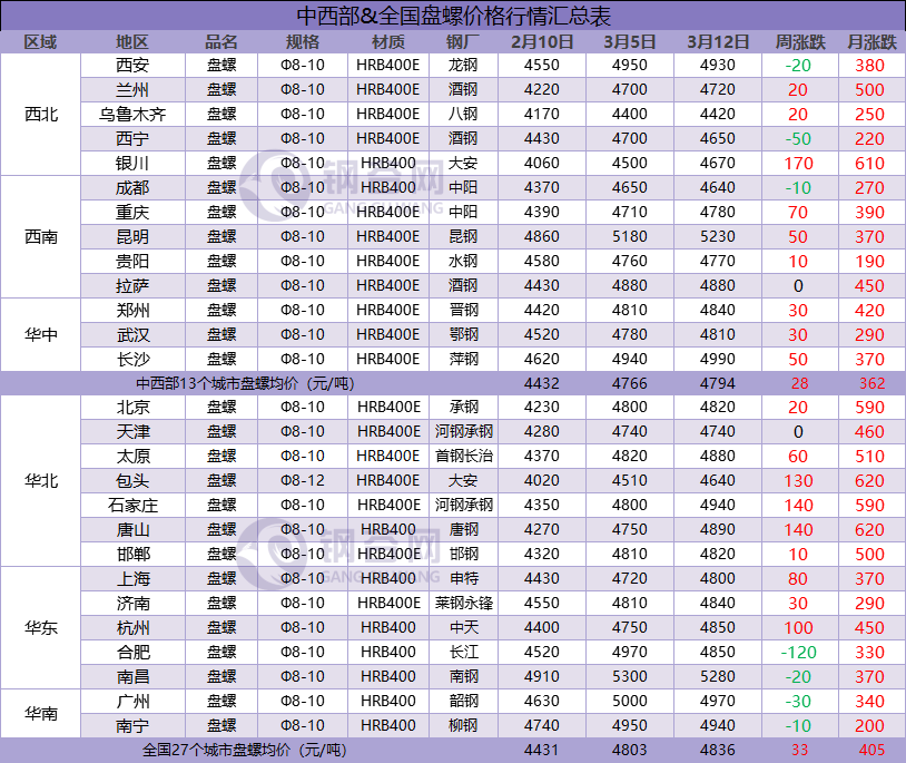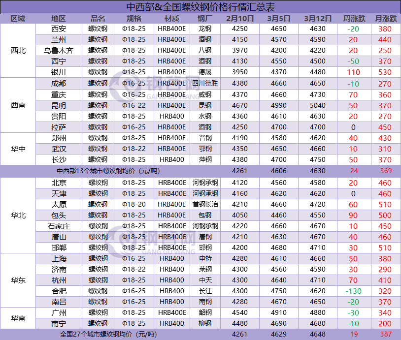 據(jù)鋼谷網(wǎng)數(shù)據(jù)監(jiān)測(cè),本周全國(guó)主要城市鋼材市場(chǎng)價(jià)格震蕩偏強(qiáng),漲幅10-180元/噸。截止3月12日,全國(guó)27個(gè)城市螺紋鋼均價(jià)4648元/噸,較上周漲19元/噸;全國(guó)27個(gè)城市高線均價(jià)4782元/噸,較上期漲31元/噸;全國(guó)27個(gè)城市盤螺均價(jià)4836元/噸,較上期漲33元/噸;全國(guó)27個(gè)城市熱軋板卷均價(jià)4970元/噸,較上周漲68元/噸;全國(guó)27個(gè)城市中厚板均價(jià)4958元/噸,較上期漲56元/噸。