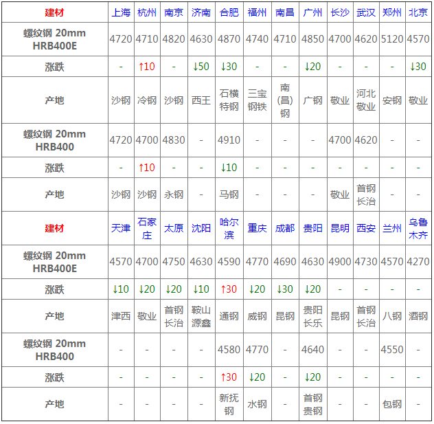 今日建材價格漲跌互現(xiàn),由于唐山環(huán)保限產(chǎn),上周市場價格一度沖高,不過由于期市表現(xiàn)并不猛烈,因此整體價格小幅抬升后呈現(xiàn)觀望態(tài)勢,預(yù)計本周價格或?qū)⒏呶槐P整運(yùn)行。