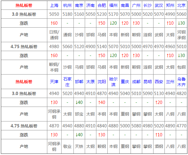 今全國熱軋市場震蕩調(diào)整,幅度10-60元,期卷持紅運(yùn)行,鋼坯回漲提振,市場心態(tài)轉(zhuǎn)好,資源止跌操作居多,然終端入市多觀望,預(yù)計熱軋板卷價格小漲觀望。