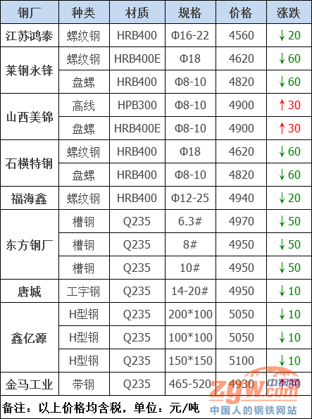 據數據監測,今日共20家鋼廠調價,其中漲幅最高為山西美錦建材,調價幅度30元/噸,跌幅最大為萊鋼永鋒建材,調價幅度60元/噸,具體調價明細如下: