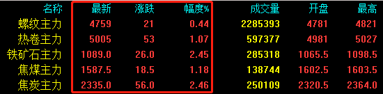期螺上漲21收報(bào)4759,期卷上漲53收報(bào)5005,鐵礦石上漲26收報(bào)1089,焦煤上漲18.5收報(bào)1587.5,焦炭上漲56收報(bào)2335。