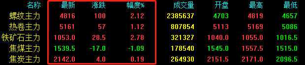 期鋼由跌轉漲,期螺上漲100收報4816,期卷上漲57收報5161,鐵礦石上漲28.5收報1053,焦煤下跌17收報1539.5,焦炭上漲4收報2142。