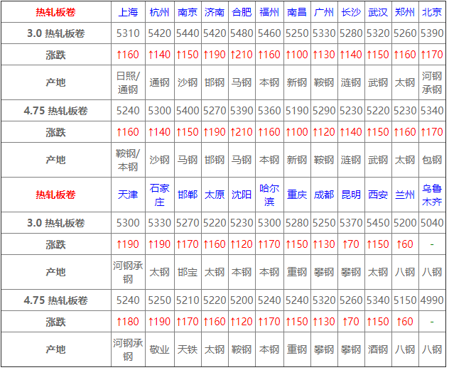 今全國熱軋市場上行調整,幅度30-200元,期卷持續高走,鋼坯再創新高,市場心態堅挺隨行上行調整,然整體出貨偏淡;預計明日仍將上漲,漲幅收窄。