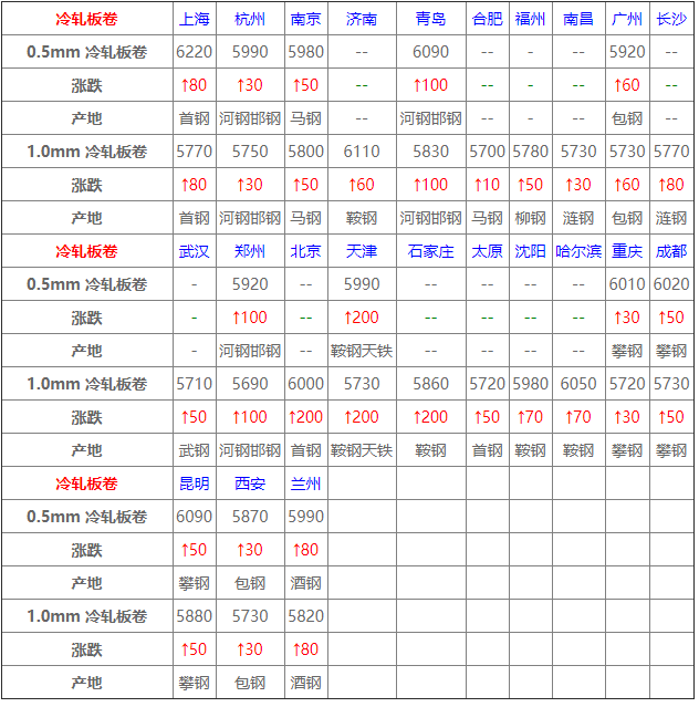今日全國冷軋市場向上調整,幅度在30-100元,市場成交清淡,下游恐高心理嚴重,原料價格大幅拉漲影響,商家跟漲心態偏強。預計明日還將上漲。