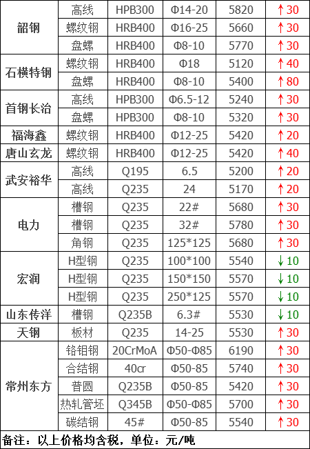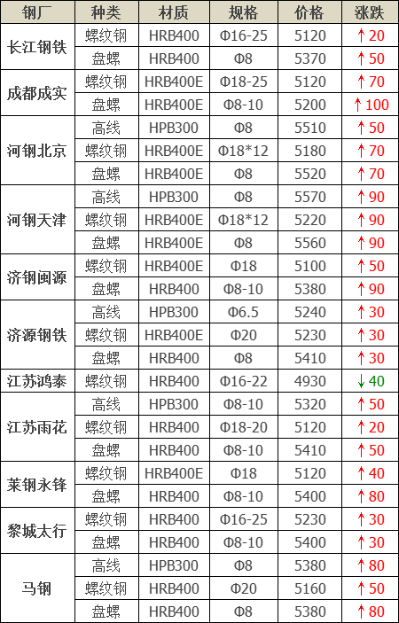 今日據(jù)統(tǒng)計(jì)的34家鋼廠調(diào)價(jià)中,漲幅最高為成都成實(shí)盤螺,調(diào)價(jià)幅度100元/噸,跌幅最大為江蘇鴻泰螺紋鋼,調(diào)價(jià)幅度40元/噸,具體調(diào)價(jià)明細(xì)如下: 華北地區(qū)調(diào)價(jià) 山西建邦建材價(jià)格平穩(wěn) 山西宏達(dá)建材價(jià)格平穩(wěn) 山西高義建材價(jià)格平穩(wěn) 電力角鋼上調(diào)30元/噸 武安裕華高線上調(diào)20元/噸 黎城太行建材上調(diào)30元/噸 河鋼天津建材上調(diào)90元/噸 首鋼長治建材上調(diào)30元/噸 福海鑫螺紋鋼上調(diào)20元/噸 唐山玄龍螺紋鋼上調(diào)40元/噸 河鋼北京建材上調(diào)50-70元/噸 唐城工字鋼價(jià)格平穩(wěn) 大成工字鋼價(jià)格平穩(wěn) 弘泰工字鋼價(jià)格平穩(wěn) 鑫億源H型鋼價(jià)格平穩(wěn) 電力槽鋼上調(diào)30元/噸 宏潤H型鋼下調(diào)10元/噸 元寶山板材價(jià)格平穩(wěn) 冀鋼中厚板價(jià)格平穩(wěn) 敬業(yè)中厚板價(jià)格平穩(wěn) 普陽中厚板價(jià)格平穩(wěn) 天鋼板材上調(diào)30元/噸 華東地區(qū)調(diào)價(jià) 馬鋼建材上調(diào)50-80元/噸 江蘇雨花建材上調(diào)20-50元/噸 濟(jì)鋼閩源建材上調(diào)50-90元/噸 長江鋼鐵建材上調(diào)20-50元/噸 石橫特鋼建材上調(diào)40-80元/噸 萊鋼永鋒建材上調(diào)40-80元/噸 江蘇鴻泰螺紋鋼下調(diào)40元/噸 山東傳洋型材下調(diào)10元/噸 常州東方優(yōu)鋼上調(diào)30元/噸 其他地區(qū)調(diào)價(jià) 韶鋼建材上調(diào)30元/噸 濟(jì)源鋼鐵建材上調(diào)30元/噸 成都成實(shí)建材上調(diào)70-100元/噸 鋼廠調(diào)價(jià)占比 上調(diào)20家,占比58.8%,調(diào)價(jià)幅度20-100元/噸; 下調(diào)3家,占比8.8%,調(diào)價(jià)幅度10-40元/噸; 持平11家,占比32.4%。 鋼廠檢修信息 4月份內(nèi)蒙古亞新檢修信息 內(nèi)蒙古亞新隆順特鋼有限公司計(jì)劃于2021年4月初對(duì)1380m3高爐進(jìn)行停產(chǎn)檢修,預(yù)計(jì)15天,影響日均鐵水產(chǎn)量0.38萬噸左右,至此廠里3座高爐全部停產(chǎn)檢修,影響日均鐵水產(chǎn)量0.82萬噸,5條軋線全部停產(chǎn),影響建材日均產(chǎn)量1萬噸左右。 重要產(chǎn)業(yè)信息 1、中鋼協(xié):3月下旬20個(gè)城市5大品種鋼材社會(huì)庫存下降6.2% 中鋼協(xié):3月下旬,20個(gè)城市5大品種鋼材社會(huì)庫存1621萬噸,環(huán)比減少107萬噸,下降6.2%,連續(xù)兩旬下降;比2月下旬減少74萬噸,下降4.4%;比年初增加891萬噸,上升122.1%;比去年同期減少285萬噸,下降15.0%。 2、河鋼8300噸精品電力角鋼直供白鶴灘-江蘇特高壓工程 日前,河鋼獲得國家重點(diǎn)工程白鶴灘-江蘇±800kV特高壓直流輸電工程項(xiàng)目8300噸電力角鋼直供訂單,產(chǎn)品將用于重慶、浙江、江蘇、安徽等區(qū)域。 3、截至2020年底廣西共有生產(chǎn)煤礦14處 產(chǎn)能506萬噸 廣西工信廳日前發(fā)布的公告顯示,截至2020年底,廣西共有生產(chǎn)煤礦14處,生產(chǎn)能力合計(jì)506萬噸/年;建設(shè)煤礦4處,建設(shè)規(guī)模合計(jì)81萬噸/年。生產(chǎn)煤礦中,南寧市2處,百色市6處,河池市3處,來賓市2處,崇左市1處。產(chǎn)能規(guī)模最大的是廣西東懷礦業(yè)有限責(zé)任公司東懷煤礦一號(hào)井,產(chǎn)能為150萬噸/年;年產(chǎn)30萬噸及以下的有9處。 4、造船市場(chǎng)回暖明顯 今年一季度,全球集裝箱船市場(chǎng)迎來一波訂單潮。根據(jù)中國船舶集團(tuán)經(jīng)濟(jì)研究中心統(tǒng)計(jì),一季度,全球累計(jì)成交集裝箱船151艘,共1659萬載重噸,以標(biāo)準(zhǔn)箱(TEU)計(jì),是2020年全年成交總量的1.6倍,并創(chuàng)下同期歷史最高紀(jì)錄;以載重噸計(jì),已占目前全球新船成交總量的52%,成為今年造船市場(chǎng)復(fù)蘇的主力。揚(yáng)子江等國內(nèi)主要船廠也紛紛宣布斬獲集裝箱船訂單。