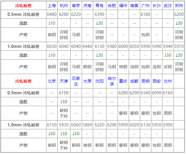 今全國冷軋市場價格穩中偏弱,調整幅度10-90元,市場高價出貨不暢,現貨讓價出貨,調整后成交未有改善,終端采購仍為謹慎,商家出貨心態偏強。