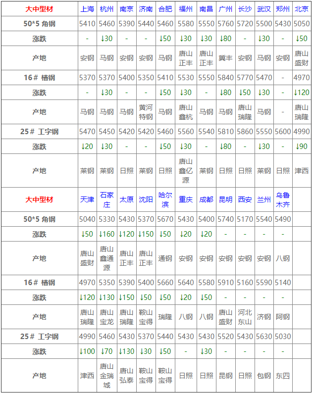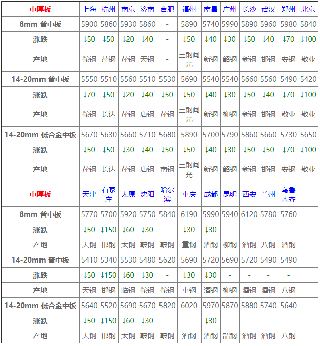 今全國中板市場弱勢運行,幅度在20-100元,市場價格跟隨原料及期貨下調,市場操作氛圍較為低迷,整體成交情況一般偏弱,下游謹慎觀望為主。