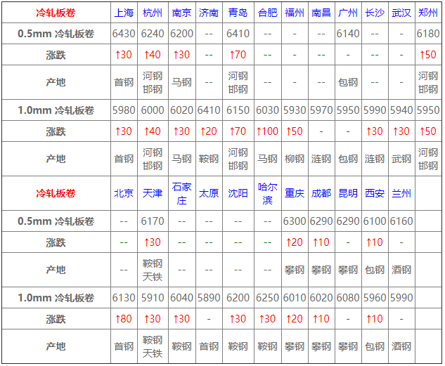 今全國帶鋼主流上行,華北主導鋼廠主流漲30,唐山窄帶漲20后成交順暢盤中追漲30累漲50,部分廠家出清日產,華東華南上行調整;