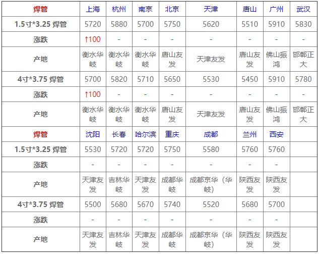 今日開市,215日唐山市場焊管價格窄幅上調,成交尚可。據富寶鋼鐵網管材研究中心市場監測顯示:成都市場1.5*3.25成都京華焊管價格為5740元/噸,4*3.75成都京華焊管價格為5730元/噸,6*4成都京華焊管價格為5780元/噸。