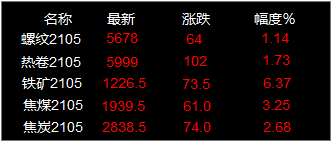 原料端繼續(xù)強(qiáng)勢(shì),無(wú)論是鐵礦石領(lǐng)漲黑色系,還是焦炭第五輪提漲范圍擴(kuò)大,都給鋼廠挺價(jià)提供了支撐。市場(chǎng)報(bào)價(jià)全面跟漲,看漲情緒推升。與此同時(shí),新版《鋼鐵行業(yè)產(chǎn)能置換實(shí)施辦法》出臺(tái),鋼鐵行業(yè)產(chǎn)量調(diào)控將進(jìn)一步加嚴(yán),鋼價(jià)將繼續(xù)呈現(xiàn)易漲難跌的行情,但仍需警惕因恐高情緒可能引起的調(diào)整。