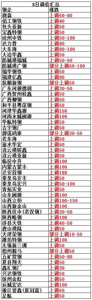 5月8日無(wú)錫新三洲特鋼上調(diào)50:鋼板10以上3700,模具鋼3640,重廢一級(jí)3490,二級(jí)3400,馬蹄鐵6以上3490,6以下3430,熱沖子3700,鋼筋切頭3780,冷沖一級(jí)3650,二級(jí)3590,瓜子片3680,破碎料一3350,不含稅。