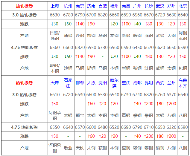 5月11日鋼鐵價格漲跌圖 5月11日建材價格:主流上漲; 今日開盤期螺高開低走,貿(mào)易商陸續(xù)下調(diào)市場價格,上午成交清淡,午后期螺反彈,市場投機情緒漸濃,報價紛紛上調(diào),成交有所轉(zhuǎn)好。綜合來看,預(yù)計明日建材價格或?qū)⒈P整向上運行。 2 5月11日熱軋板卷價格:漲價居多; 今全國熱卷漲跌穩(wěn)均現(xiàn),幅度20-700,華東市價先弱后強,期卷收高,成交表現(xiàn)不一,其余地區(qū)商戶心態(tài)謹(jǐn)慎多顯觀望,挺價意愿仍存,市場交投平平;