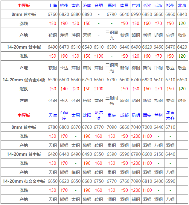 4 5月11日中厚板價格:寬幅上行; 今全國中板漲多跌少運行,幅度集中80-300,期貨高位震蕩運行,商家挺價意愿不減,市場情緒不一,整體成交氛圍一般。