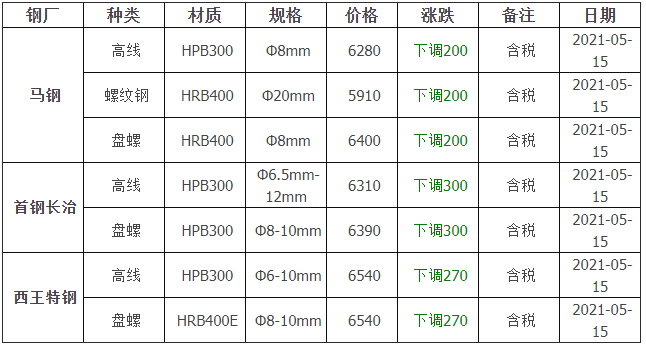 2021年5月15日 鋼廠調價匯總:跌了280!5月15日鋼廠最新調價! 鋼廠調價通知。