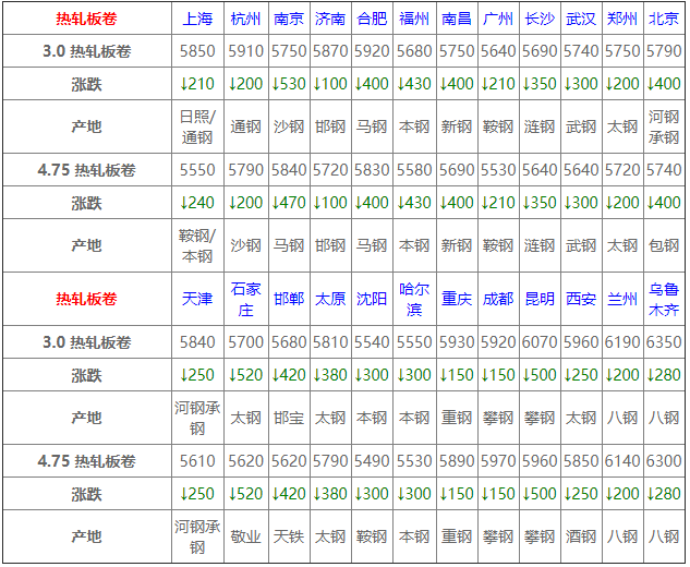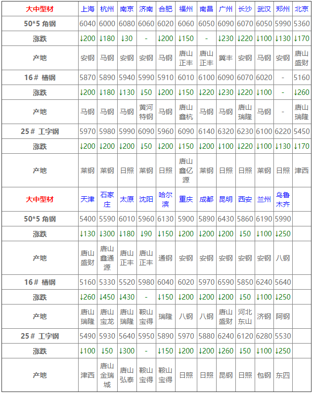 5 5月20日熱帶價格:下行為主; 今全國帶鋼主流下行,華北主導鋼廠降350-400,唐山窄帶降350-400不等,降后仍一般偏弱,僅個別低位可,華東華南弱勢下行; 6 5月20日型材價格:繼續走低; 今型價全面下調。坯料弱勢支撐,鋼廠指導價弱勢下調,利空情緒明顯,下游拿貨滯后,觀望氣息濃烈。短期型價繼續走低。