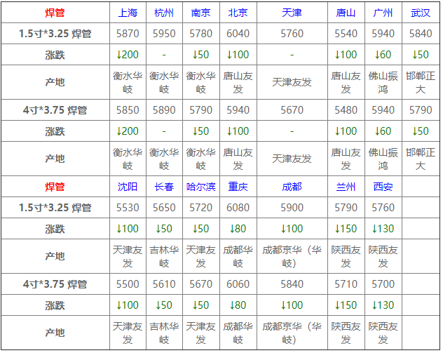 今管材價格仍在下跌,成交一般。原料端弱勢調整,廠商成交偏弱,終端需求不急預期,商家多謹慎觀望。預計明穩中下調。
