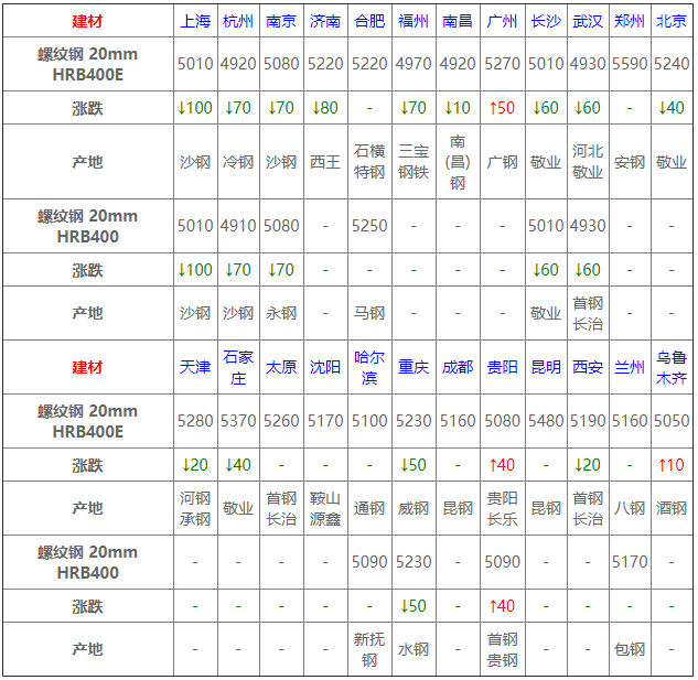 6月1日鋼鐵價格漲跌圖