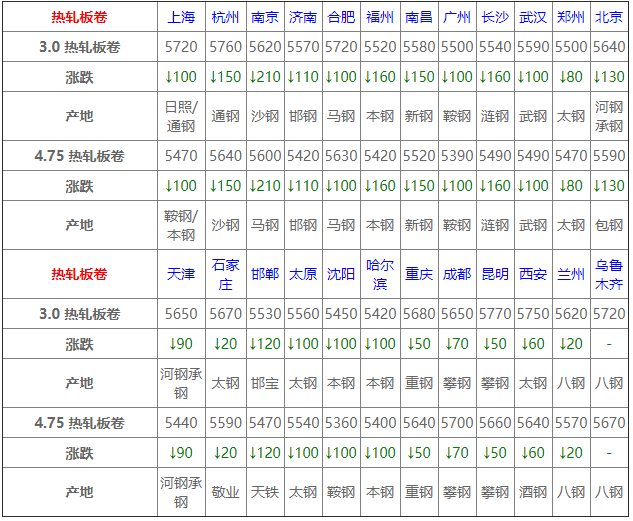 6月1日熱軋板卷價格:普遍下跌;